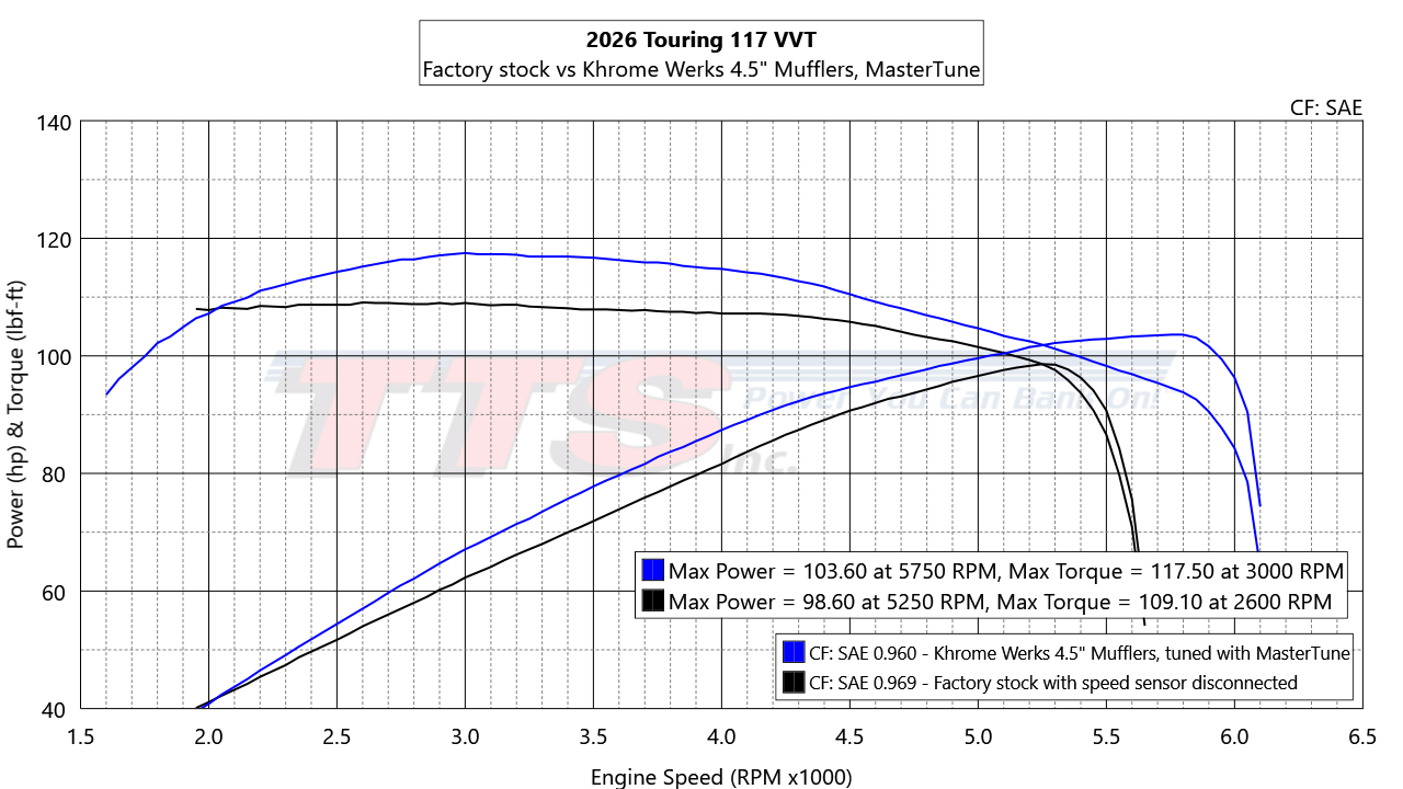 2026 Touring 117 VVT Factory stock vs Khrome Werks 4.5" Mufflers, MasterTune